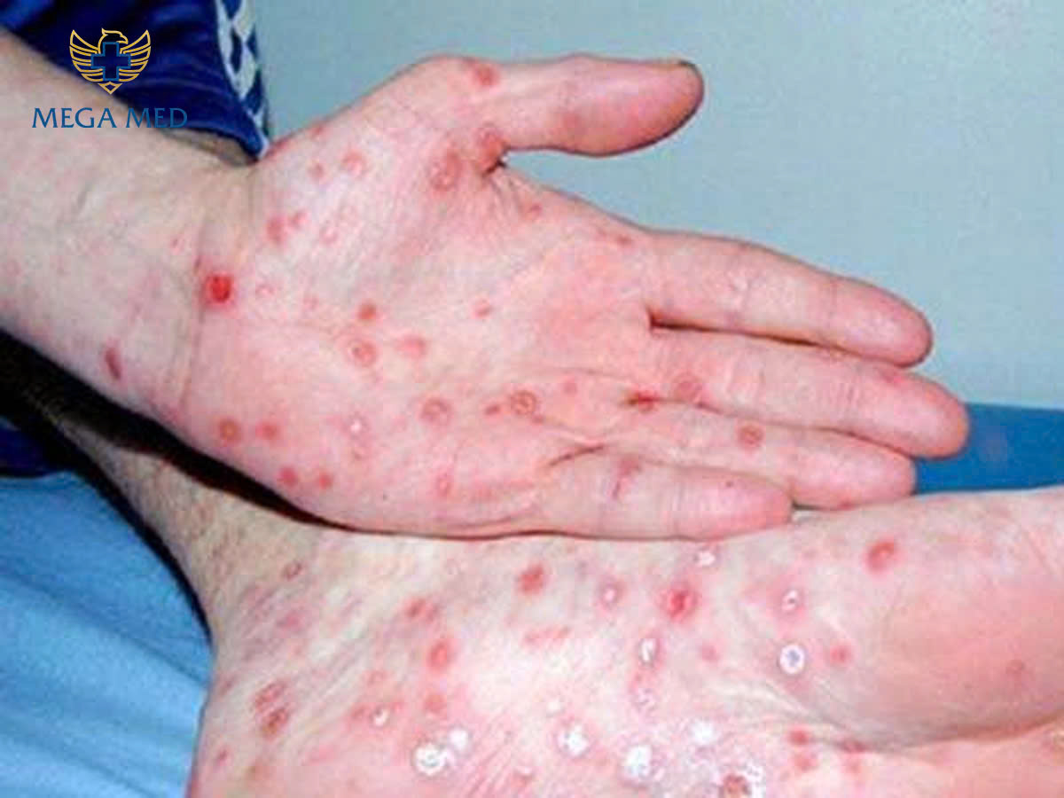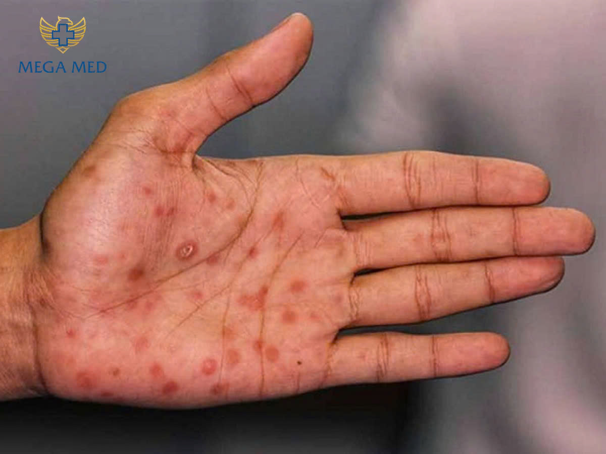 Hình ảnh Giang mai ở giai đoạn 2: Các nốt mẩn đỏ xuất hiện ở lòng bàn tay, lòng bàn chân