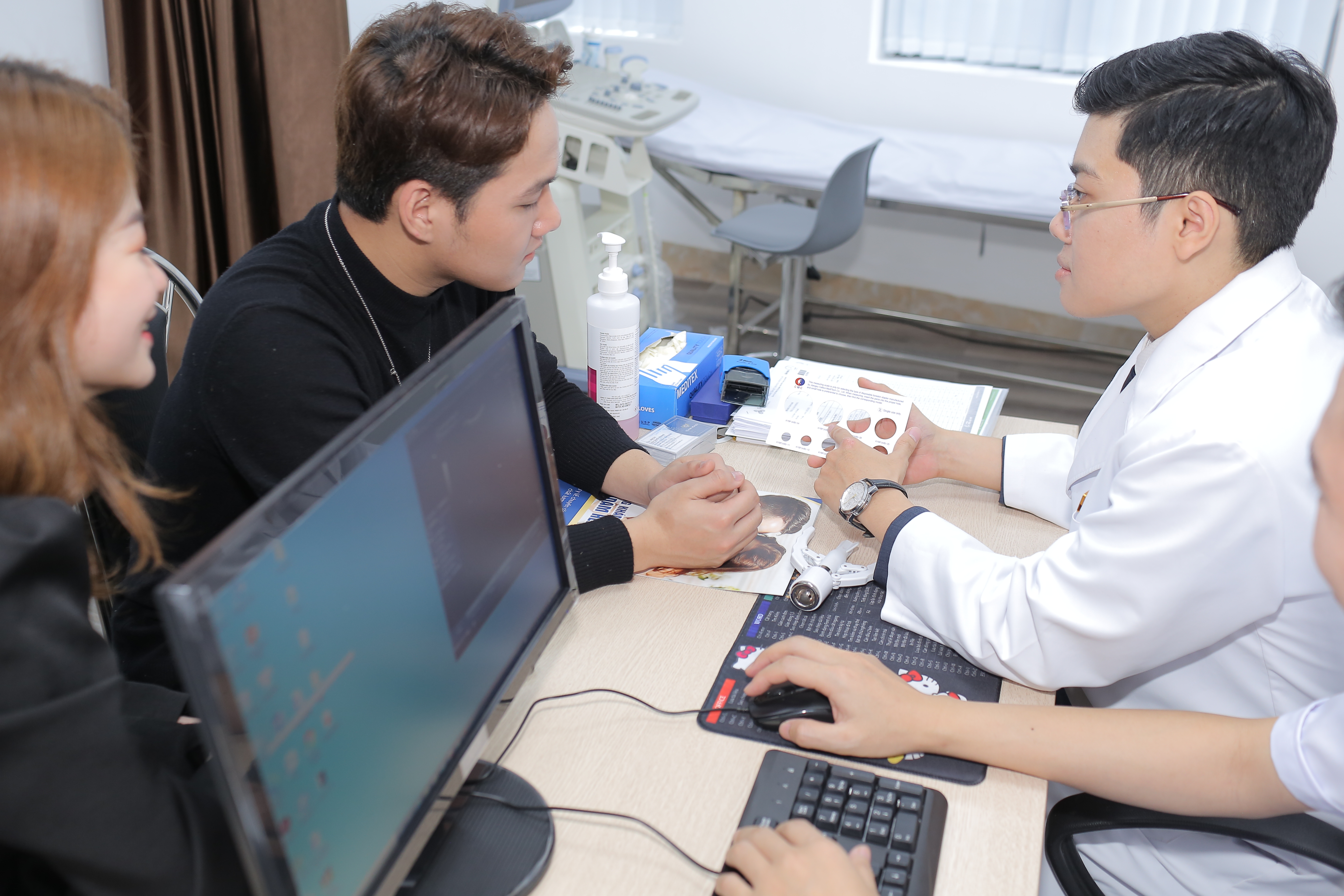 Bệnh nhân được xem kết quả vừa thực hiện, nhân viên y tế hướng dẫn chăm sóc sau cắt bao quy đầu